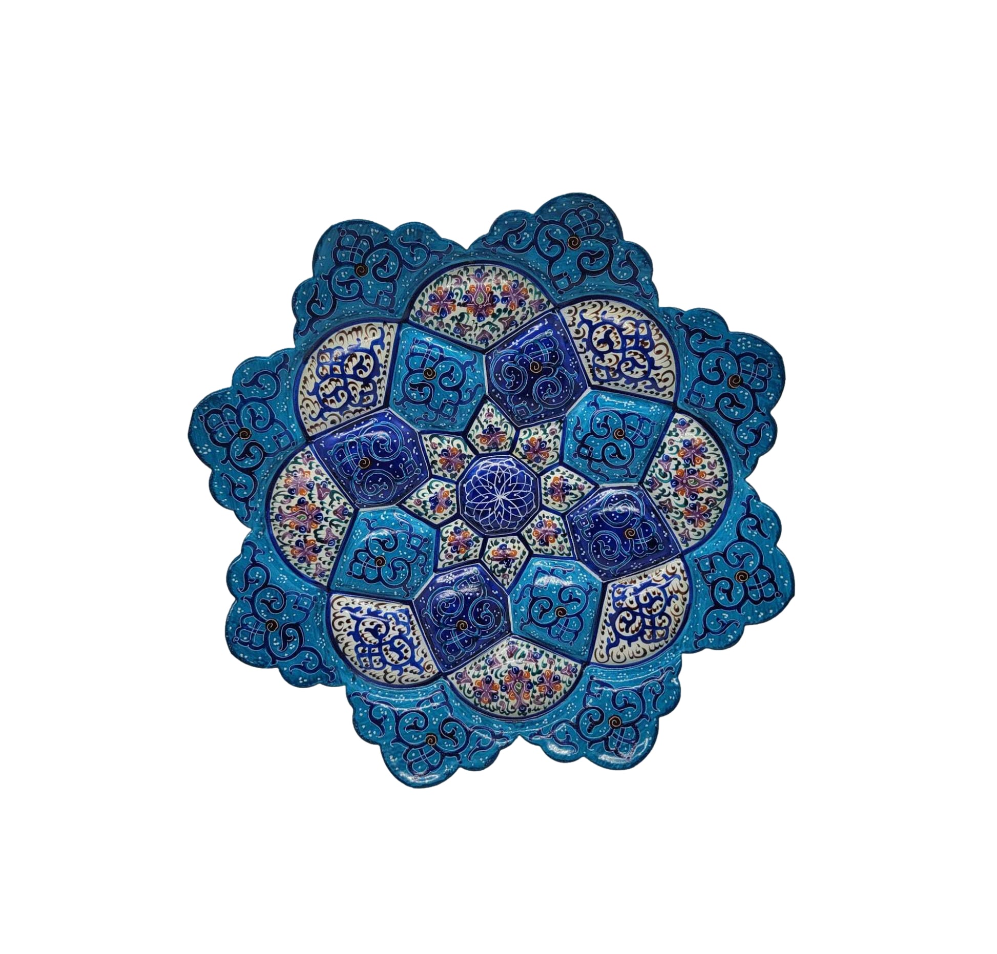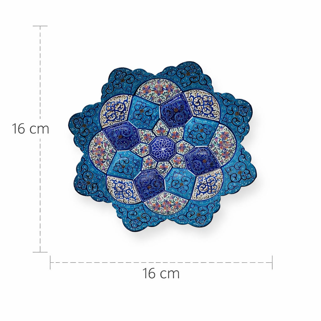 Design 1007 exemplifies the refined sophistication of Persian minakari enameling, distinguished by its harmonious balance of ornamental complexity and visual restraint. Artisans meticulously hand-paint intricate patterns combining stylized botanical forms with geometric precision onto a copper substrate using traditional enamel pigments. Through sequential high-temperature firings, the glazes fuse permanently to create a non-porous, vitrified surface of exceptional durability and luminosity. The carefully calibrated color palette achieves remarkable chromatic depth, with each hue complementing the compositional whole. This minakari plate represents the culmination of centuries-old techniques refined through generations of master craftspeople, offering collectors an authentic artifact of Persian artistic tradition and uncompromising craftsmanship.