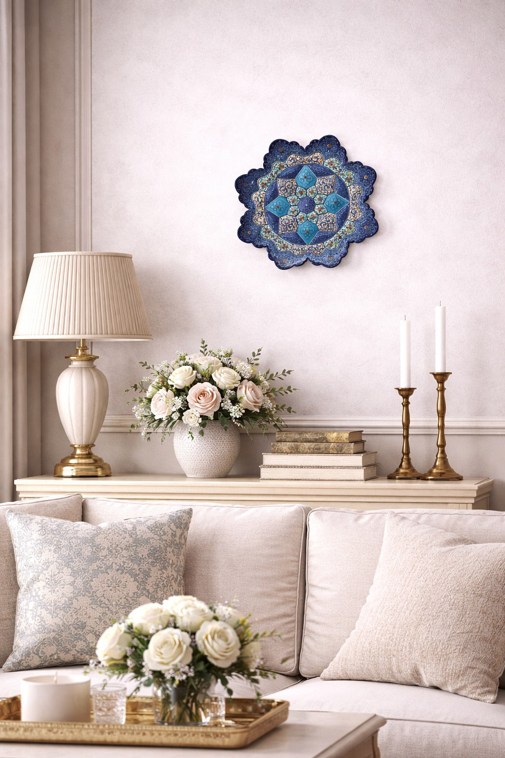 Design 1009 represents a distinguished achievement in Persian minakari artistry, characterized by its intricate iconography and masterful execution. Skilled artisans hand-paint elaborate decorative schemes combining naturalistic botanical imagery with geometric patterning onto a copper base using traditional enamel formulations. Through controlled multi-stage firing processes, the glazes achieve permanent molecular bonding, resulting in a non-porous surface of exceptional resilience and visual brilliance. The sophisticated color composition demonstrates refined aesthetic sensibility, with each pigment selected to enhance overall chromatic harmony. Design 1009 embodies the rigorous standards of authentic minakari production, requiring years of specialized training to execute with precision. This handcrafted plate serves as both a functional vessel and a museum-quality artifact, preserving the technical excellence and cultural significance of Persian enameling traditions.