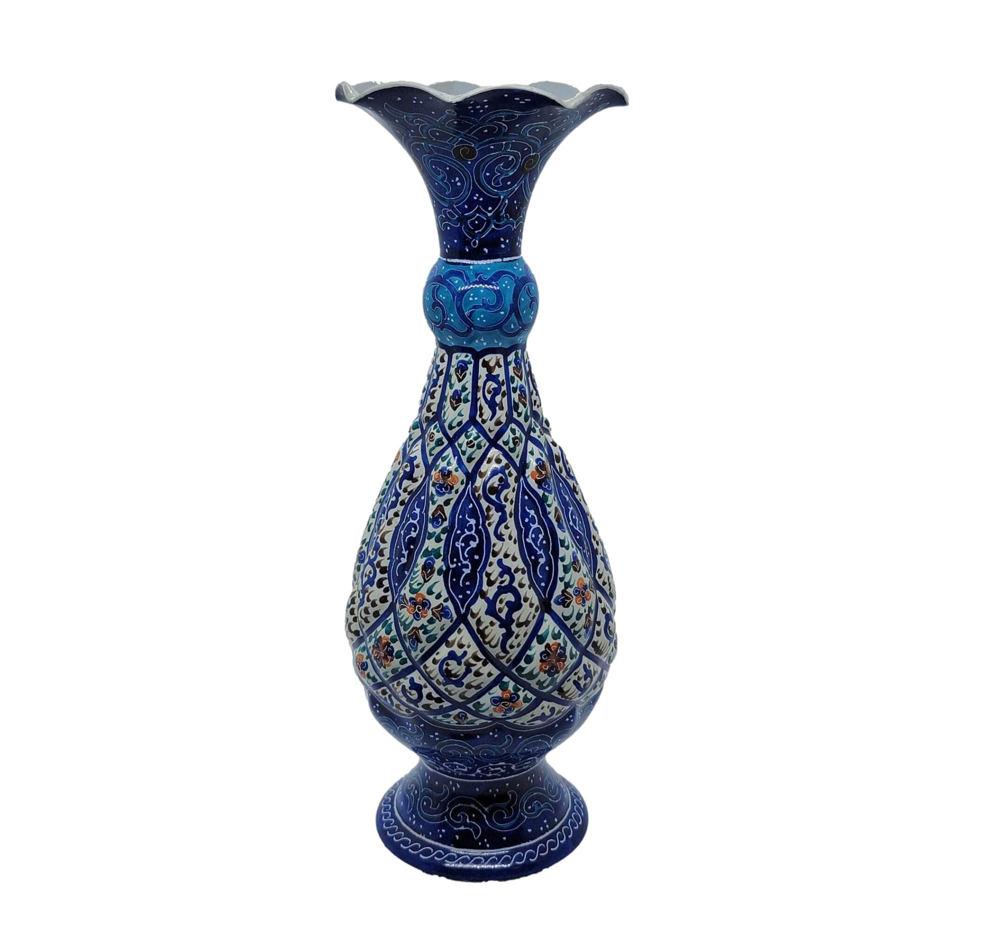 Design 1003 represents a masterwork of Persian minakari craftsmanship adapted to functional vessel design, showcasing the discipline's remarkable versatility. Skilled artisans hand-paint elaborate decorative schemes combining naturalistic floral imagery with geometric precision onto a copper pot using traditional enamel formulations. Through controlled sequential firings at elevated temperatures, the glazes achieve permanent molecular fusion, resulting in a non-porous, corrosion-resistant surface of exceptional longevity. The sophisticated color composition demonstrates refined aesthetic judgment, with each pigment selected to create chromatic harmony and visual luminosity. Design 1003 embodies the rigorous standards of authentic minakari production, requiring years of specialized training to execute with mastery. This individually crafted pot merges functional capability with artistic distinction, serving as both a practical vessel and a tangible expression of Persian heritage and uncompromising artisanal excellence.